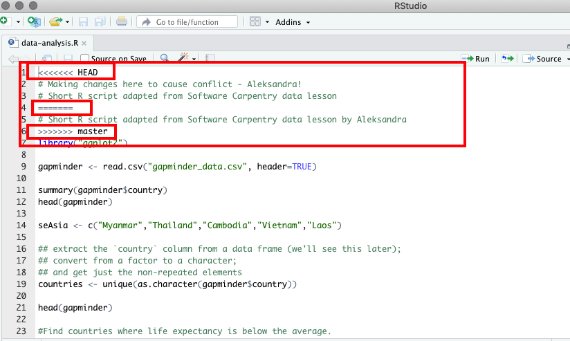 In a case of conflict, Git will not simply overwrite one version of the file over another. The user needs to manually indicate that the conflict is resolved. But first of all, what does actually happen inside the conflicted file? Let’s open it in RStudio